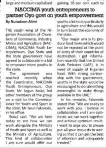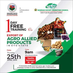 NACCIMA YOUTH ENTREPRENEURS , OYO STATE CHAPTER ORGANISED A ONE-DAY FREE EXPORT TRAINING OF AGRO ALLIED PRODUCTS FOR OVER 300 YOUTHS ACROSS THE STATE.